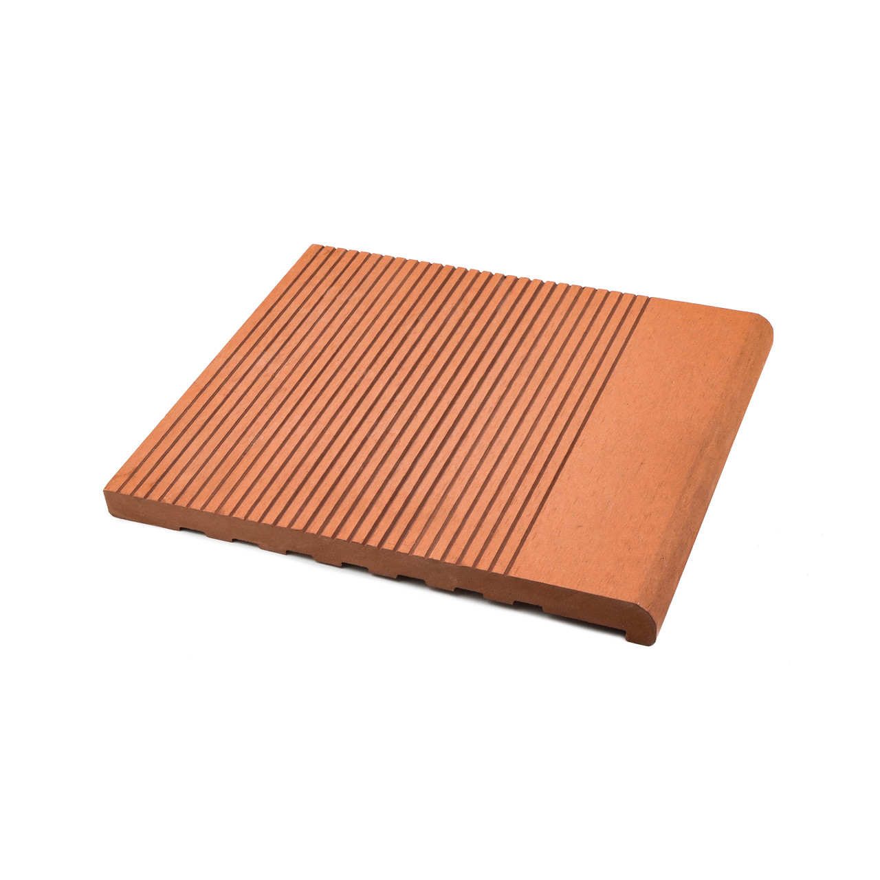 Ступень из ДПК Sinodeck Passa, производство Китай, в отличие от натуральной древесины не требует специального ухода. Цвет полностью идентичен цвету террасной доски. Благодаря монолитности конструкции, ступени из ДПК выдерживают нагрузку до 2000кг/м2, что особенно важно про монтаже входных групп. Поверхность ступеней имеет антискользящее покрытие.